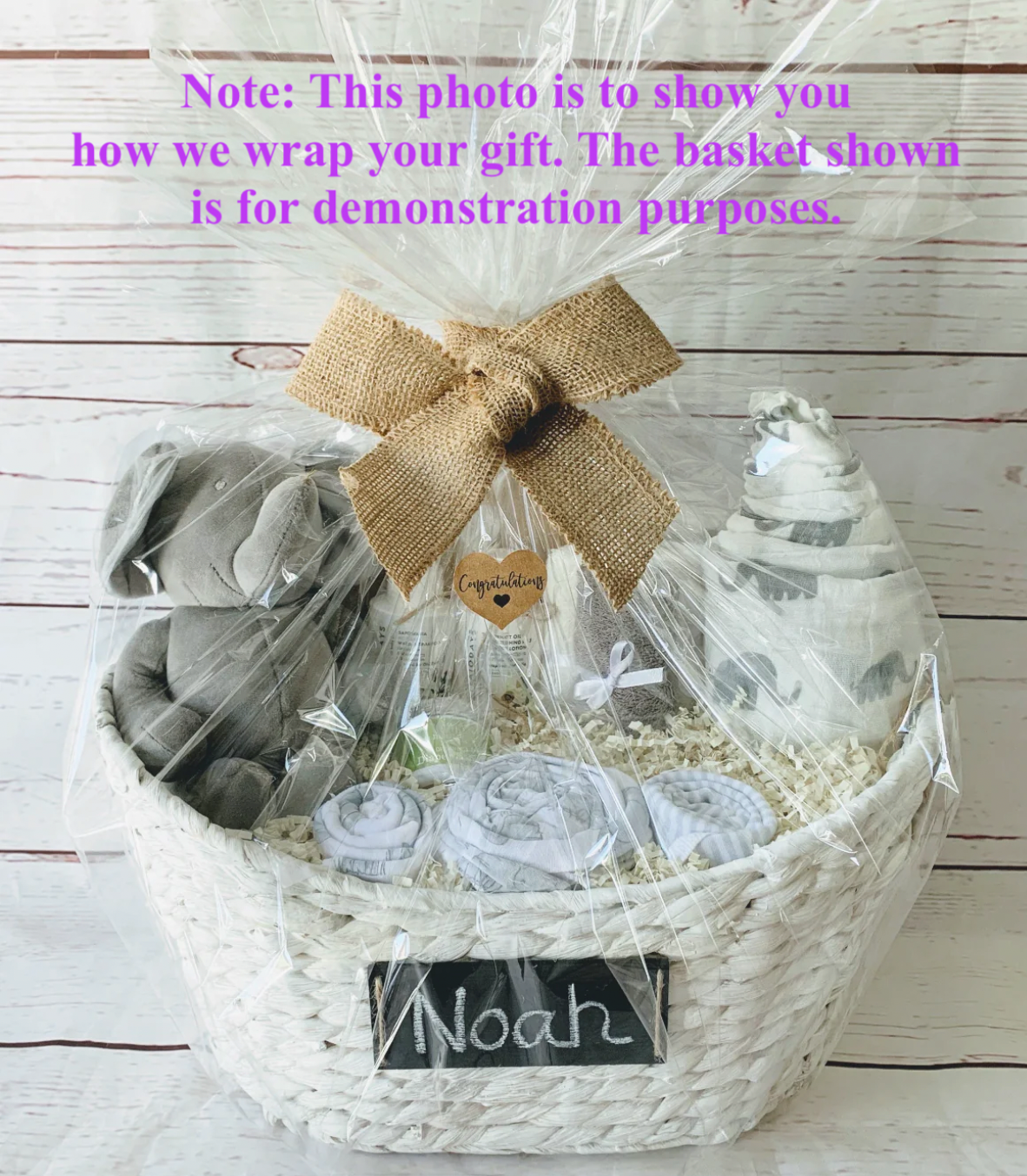 • 🧺 Reusable white woven hyacinth basket (14.25" x 7") with chalkboard front for baby’s name