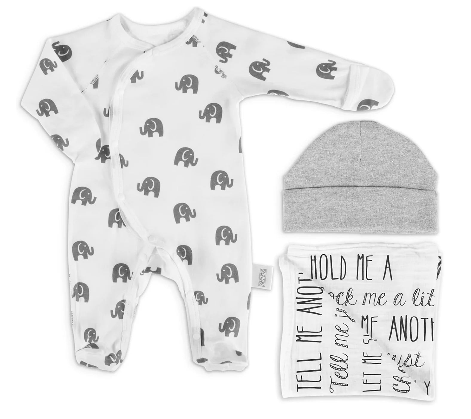 • 🐘 β€œTake Me Home” Elephant Outfit – Adorable 2-piece Sleep & Play + matching cap (0–3M, 100% cotton).