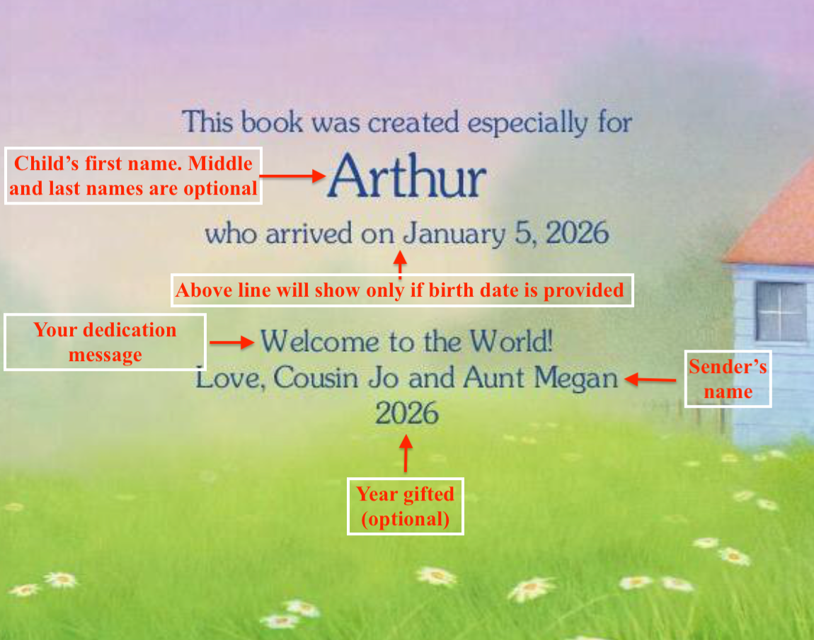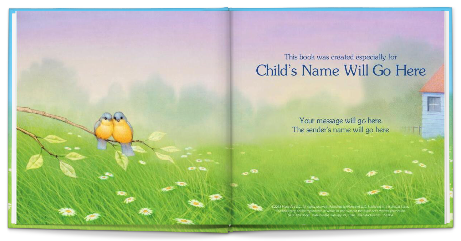 The child's name appears throughout the book - on a hat, a backpack, a pillow, as well as the cover, dedication page, and several times in the story itself.