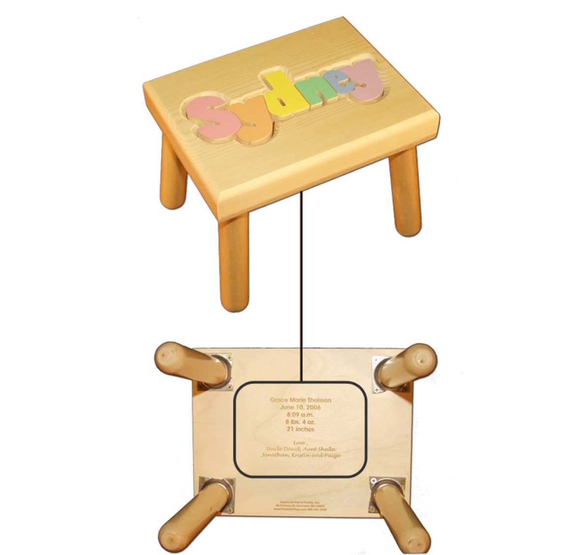 The Keepsake Flower Name Puzzle Stool in your choice of Primary or Pastel Colors makes a memorable gift that’s as practical as it is adorable. Crafted from solid furniture-grade Ponderosa Pine, this sturdy name stool helps little ones reach new heights.